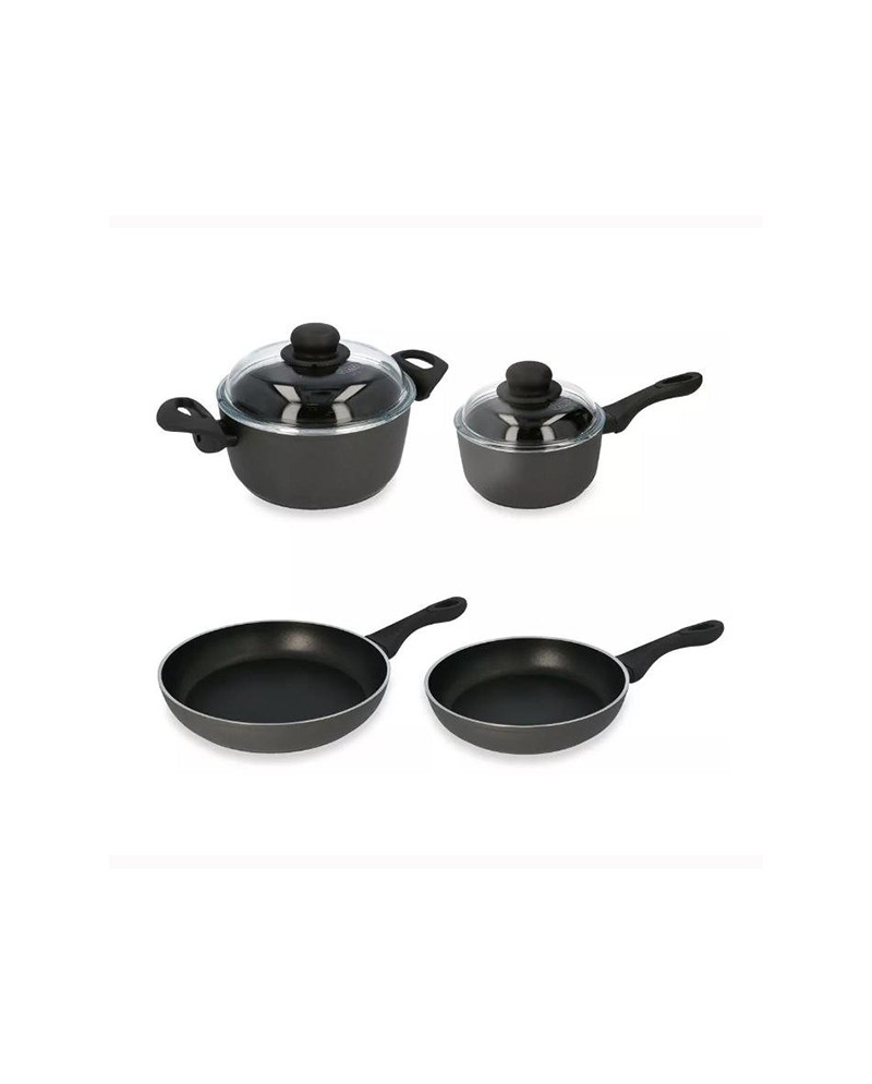 Il set comprende: 1 casseruola a un manico diametro 16 cm, 1 casseruola a due manici 20 cm, 1 padella 24 cm, 1 padella 28 cm, 1 coperchio in vetro da 16 cm e 1 coperchio in vetro da 20 cm.