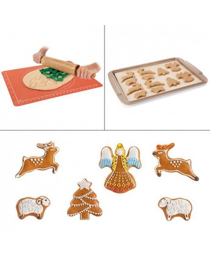 Con questo tagliabiscotti in plastica si ricava con un solo gesto 6 sagome a tema natalizio: albero di Natale, angelo, due renne e due pecore.