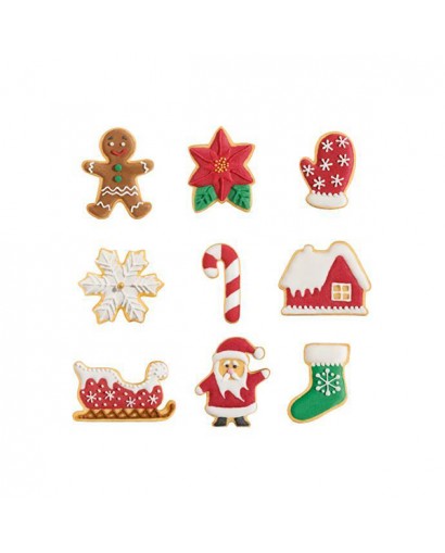 Tagliabiscotti in plastica con 9 sagome natalizie: la calza, la casetta, il guanto a manopola, Babbo Natale, l'omino di pan di zenzero, il bastoncino di zucchero, la stella, il fiocco di neve e perfino la slitta di Babbo Natale.