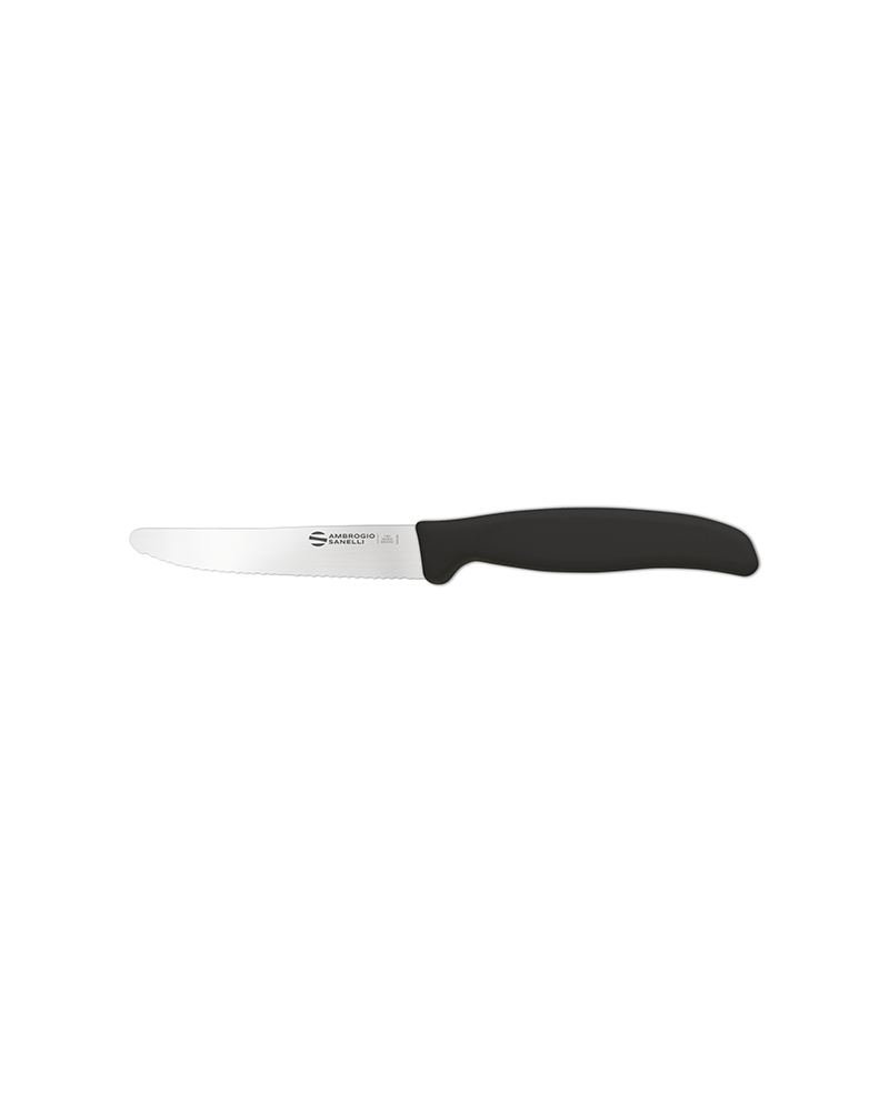 Coltello da cucina in acciaio inox e manico nero, ergonomico in polipropilene e gomma termoplastica.