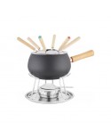 La confezione contiene una base in acciaio con supporto in metallo cromato, una casseruola con coperchio in acciaio smaltato, 6 cucchiaini per salse,6 forchettine, 6 piatti fonduta colore bianco, 6 ciotole in gres e un fornelletto apribile di ultima generazione per utilizzare cialde combustibili.