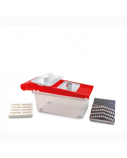 Grattugia con 4 inserti intercambiabili, dotata di specifico box contenitore da 1,5 l con coperchio, realizzato in polipropilene e piedini antiscivolo.