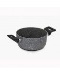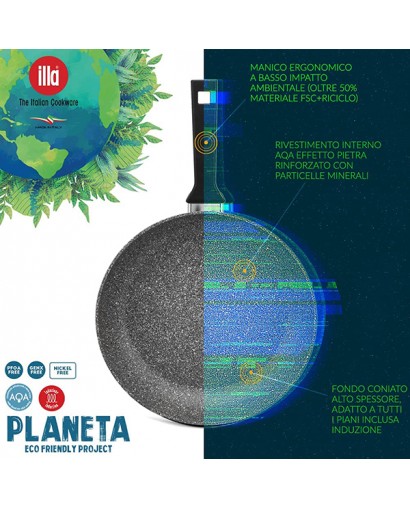 Padella in alluminio riciclato con rivestimento interno AQA effetto pietra rinforzato con particelle minerali e rivestimento esterno PTFE effetto pietra.