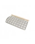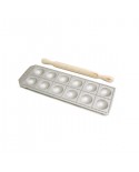 Calder Raviolatore con rullo.  Raviolatore quadro in alluminio 48 posti con rullo in legno. Dimensione: 28 x 10 cm, raviolo 1,6 × 1,6 cm.