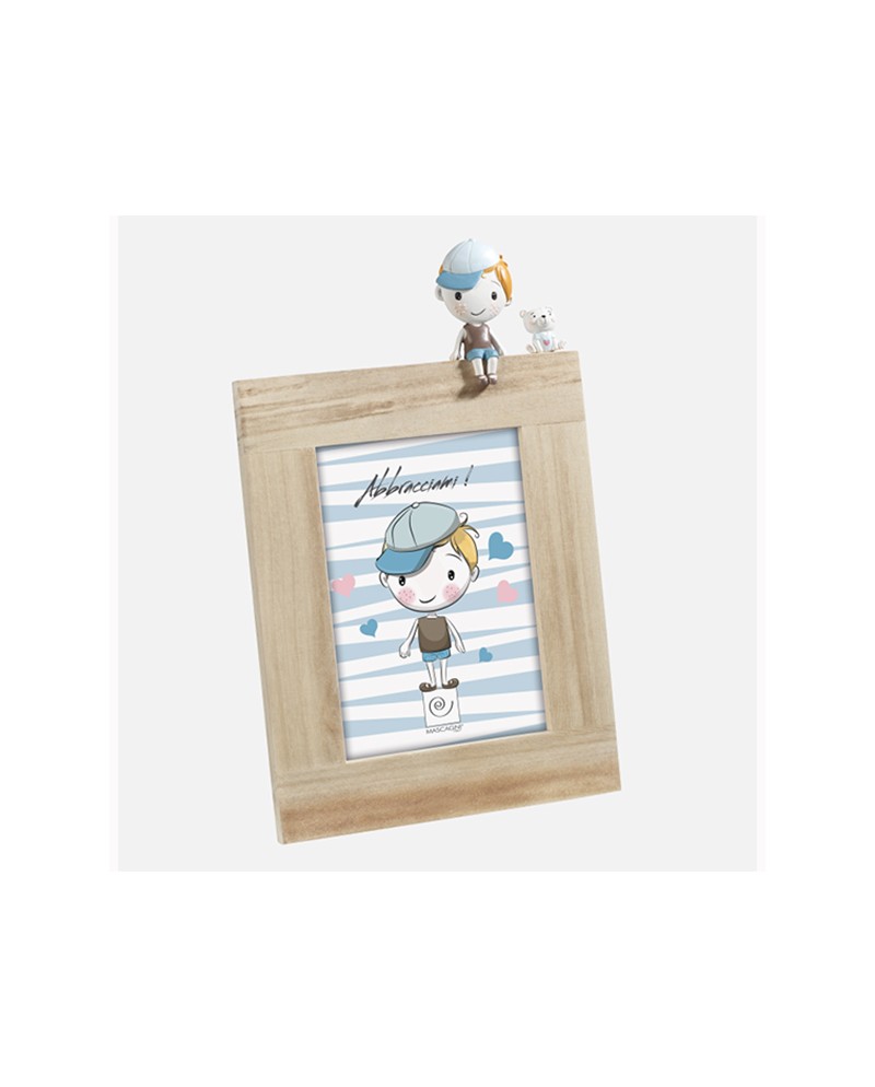 Cornice per foto singola in legno chiaro, nella parte alta della cornice troviamo un bambino con un orsetto.