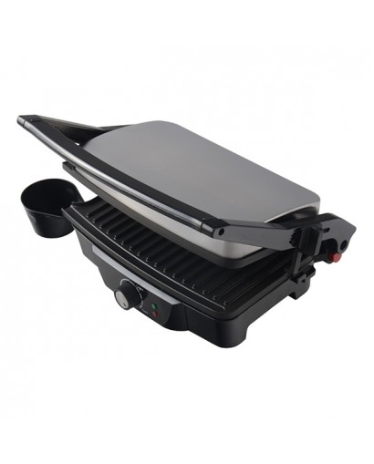 Piastre rigate antiaderenti. Piastra superiore basculante, adattabile ai diversi spessori dei cibi.